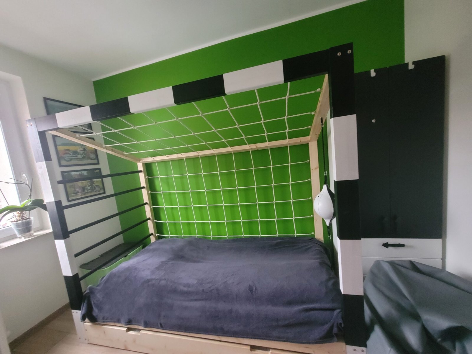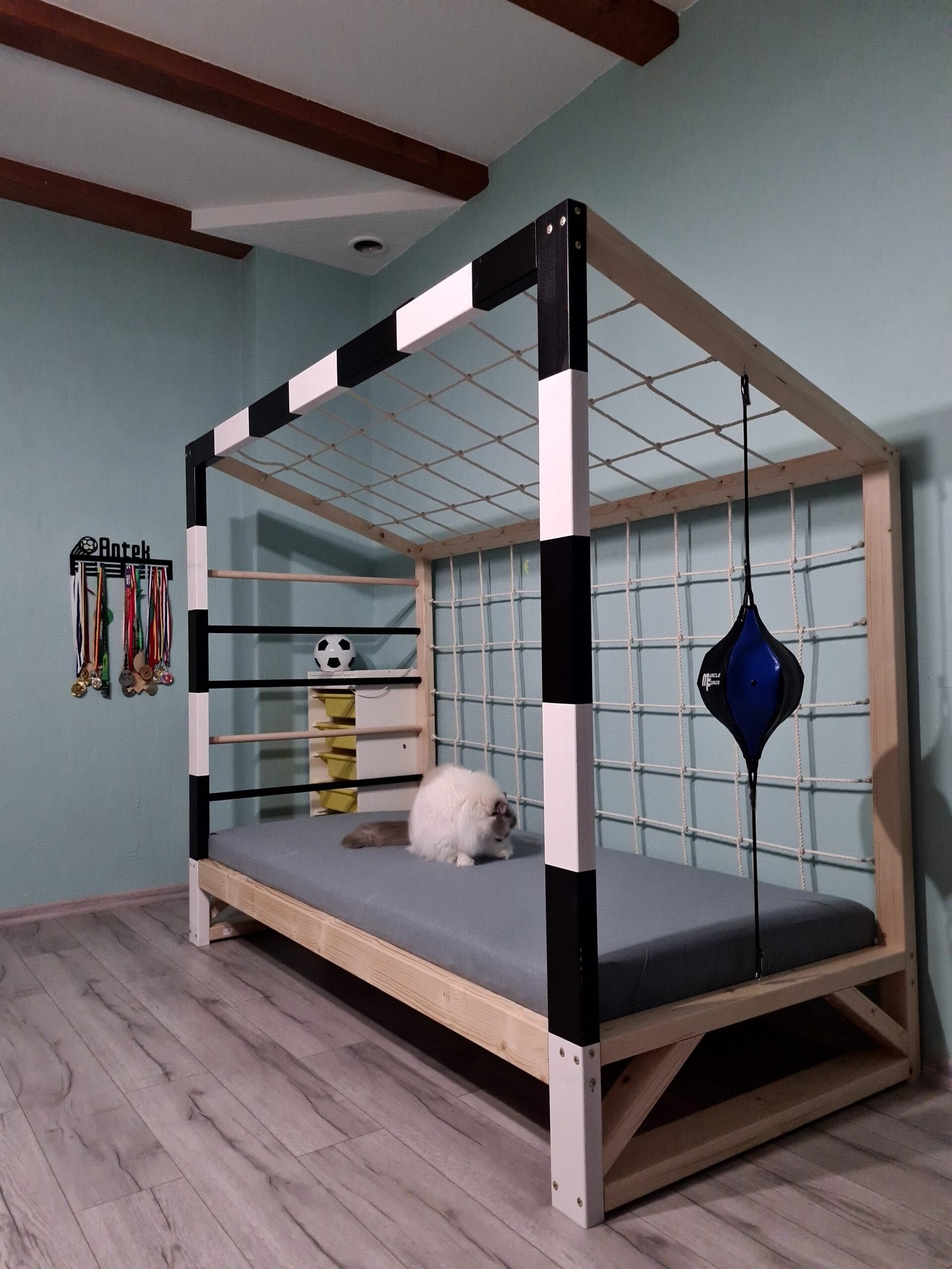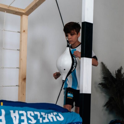 Jesteśmy jedyną firmą, która łóżko-bramkę wyposaża w standardzie w bezpieczne gruszki bokserskie i drążki gimnastyczne.